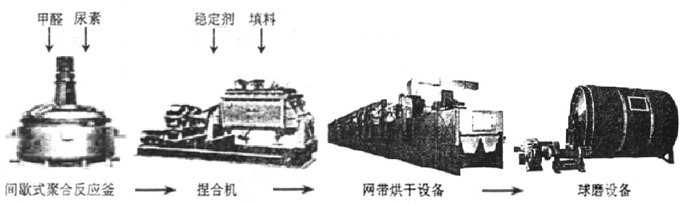 在氨基模塑料生产过程中,主要设备有:间歇式聚合反应釜、捏合机、网带烘干机以及球磨机等。间歇式聚合反应釜主要用来合成脲醛树脂,而捏合机主要用来完成填料与树脂的混合操作,网带烘干机主要对捏合后的物料进行干燥,去除其中的水份和未反应的小分子,球磨机主要是对经干燥粉碎的固体料进行球磨,达到一定规格的粉状物料,以便后续成型加工生产厂家使用。