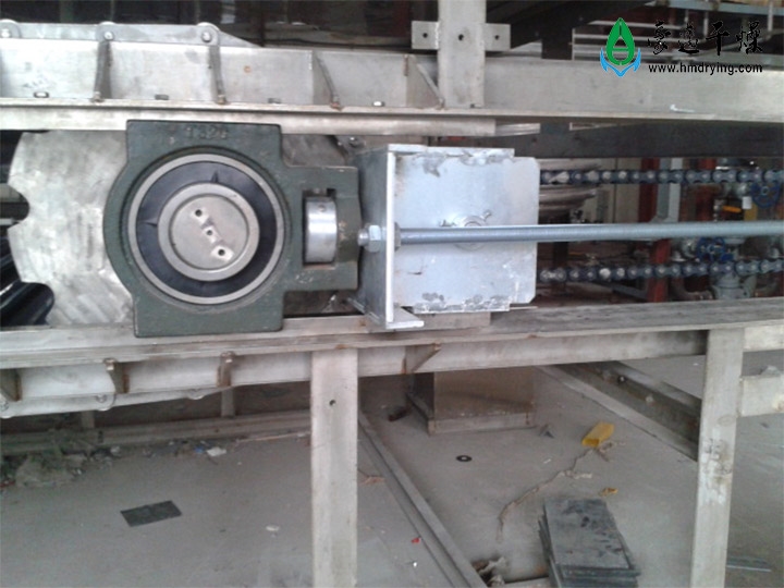(4) 高吸水性树脂干燥机输送系统两侧设有导向装置,用于纠正输送带运行时左右偏差,保证输送系统的正常输送。