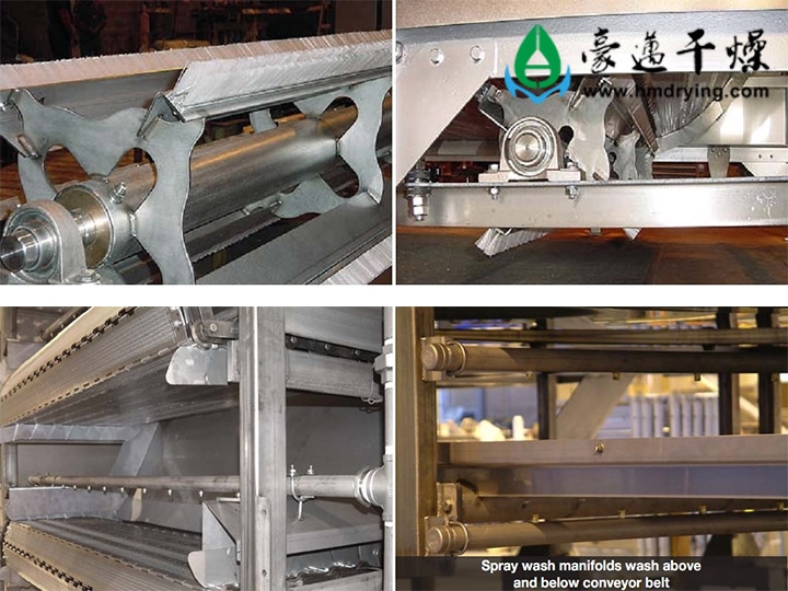 (3) 高吸水性树脂干燥机设置网带清扫和清洗结构,提高了带机对粘性强物料的适应性,使再次进入布料的传送网带干净、清洁无杂质,保证干燥后产品的质量。