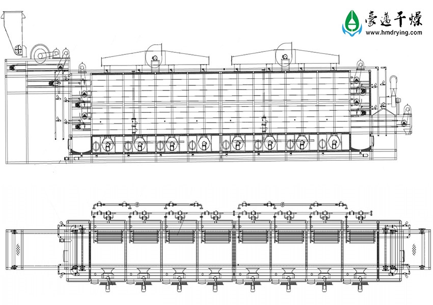 (3) 新型输送系统由变频减速电机、输送链条、输送网带、网带撑杆、挡料板、传动链轮、传动轴和张紧装置等组成,以均匀干燥物料,降低能耗,具有干燥与冷却一体、生产操作简洁且自动化程度高的优点;