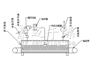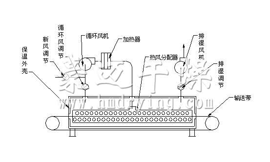 DWP型属于喷射气流带式干燥,原理见图。该型设备中热风以狭缝流或孔束流向下或上下同时喷向输送带上的物料,由于喷射气速高达15m/s以上,故对流传热的传热膜极薄,传热系数大,干燥速度快。此型设备用于不透气类物料时热风上下同时喷吹,经风机再参与循环。对透气性物料气流束具有强穿透性,及在物料内部的扩散性。该型设备主要用于纤维板、石膏板、纸箱板、纸浆模、涂布干燥等,也适用于片状、条状、颗粒装物料及一些特殊物料的干燥。如果采用双向气流喷射,板材类物料变形小,其他类型物料受热均匀,不易产生夹心状态。喷射气流带式可以使用蒸汽、电、燃煤热风炉及燃油烟通气作为热源。