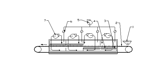 1.加料器 2.输送带 3.加热器 4.分风器 5.排湿风机 6.调节阀 7.循环风机