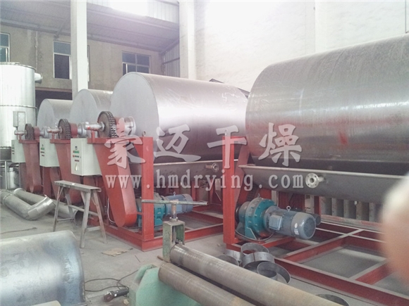 滚筒刮板干燥机是附在回转的滚筒筒体上液相物料以热传导的方式进行连续操作的干燥设备。料液同布料装置在一定的转速回转的滚筒外壁上形成料膜,被连续通入的加热介质(水蒸汽或导热油)的热滚筒壁所加热,料膜被干燥后由刮刀刮下。